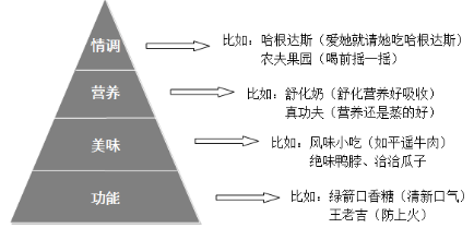 如上圖所示,這可以說是馬斯洛需求層次理論在食品行業中深度的實踐版。從消費者需求層次層面來劃分的話,食品的價值屬性由低到高可歸結為四類:功能、美味、營養和情調。
