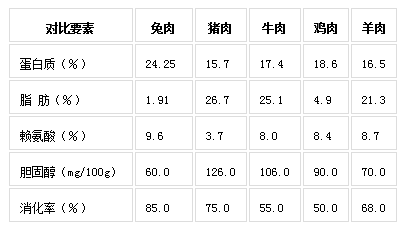 現代科學研究表明,兔肉營養價值豐富,纖維細嫩,味道鮮美,適合現代生活對肉質的要求。兔肉具有高蛋白(含蛋白質21~23%)、高賴氨酸(賴氨酸占蛋白質的9.6%)、高消化率(達85%)、高煙酸(高達12.8毫克/百克);低脂肪(僅為4.9%)、低膽固醇(為65毫克/百克)、低脲酸、低熱量等特點。因此,兔肉自古以來便享有“葷中之素”的美稱。
